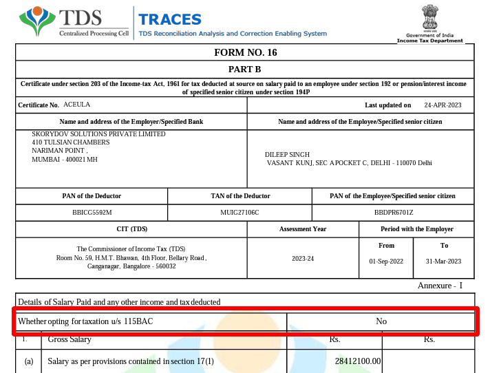 Choose the regime what you have declared to your employer. To find out what you have declared, check your Form-16 Part-B and see what is mentioned for ‘Whether opting for taxation u/s 115BAC’. It means whether you have opted for New Regime! See the reference below.