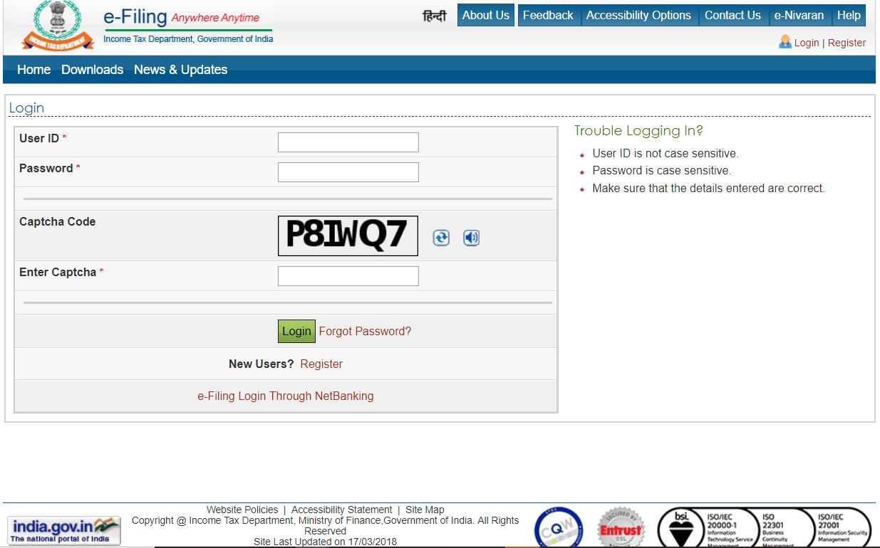 Visit https://incometaxindiaefiling.gov.in and click on "Login Here" option in case you already have an account on this website or click on "Register Yourself" button to create a new account.